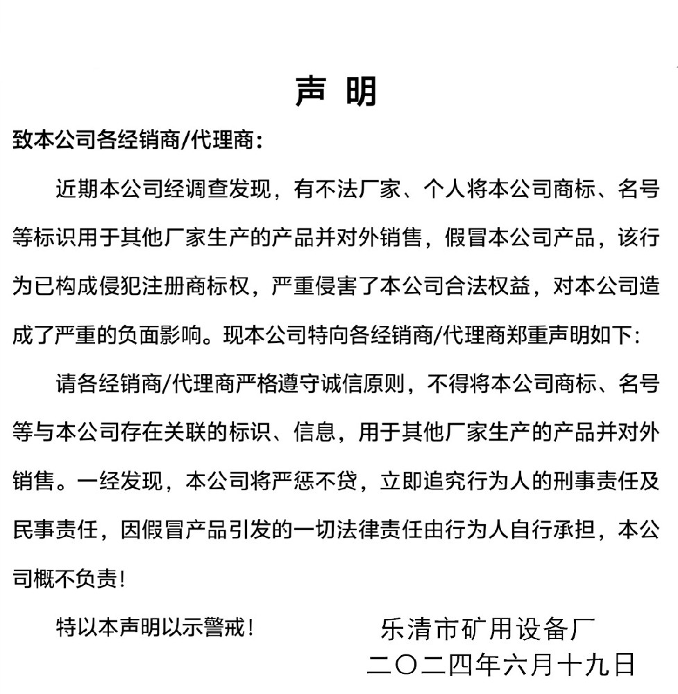 聲 明致本公司各經銷商/代理商:近期本公司經調查發現,有不法廠家、個人將本公司商標、名號等標識用于其他廠家生產的產品并對外銷售,假冒本公司產品,該行為已構成侵犯注冊商標權,嚴重侵害了本公司合法權益,對本公司造成了嚴重的負面影響。現本公司特向各經銷商/代理商鄭重聲明如下:請各經銷商/代理···